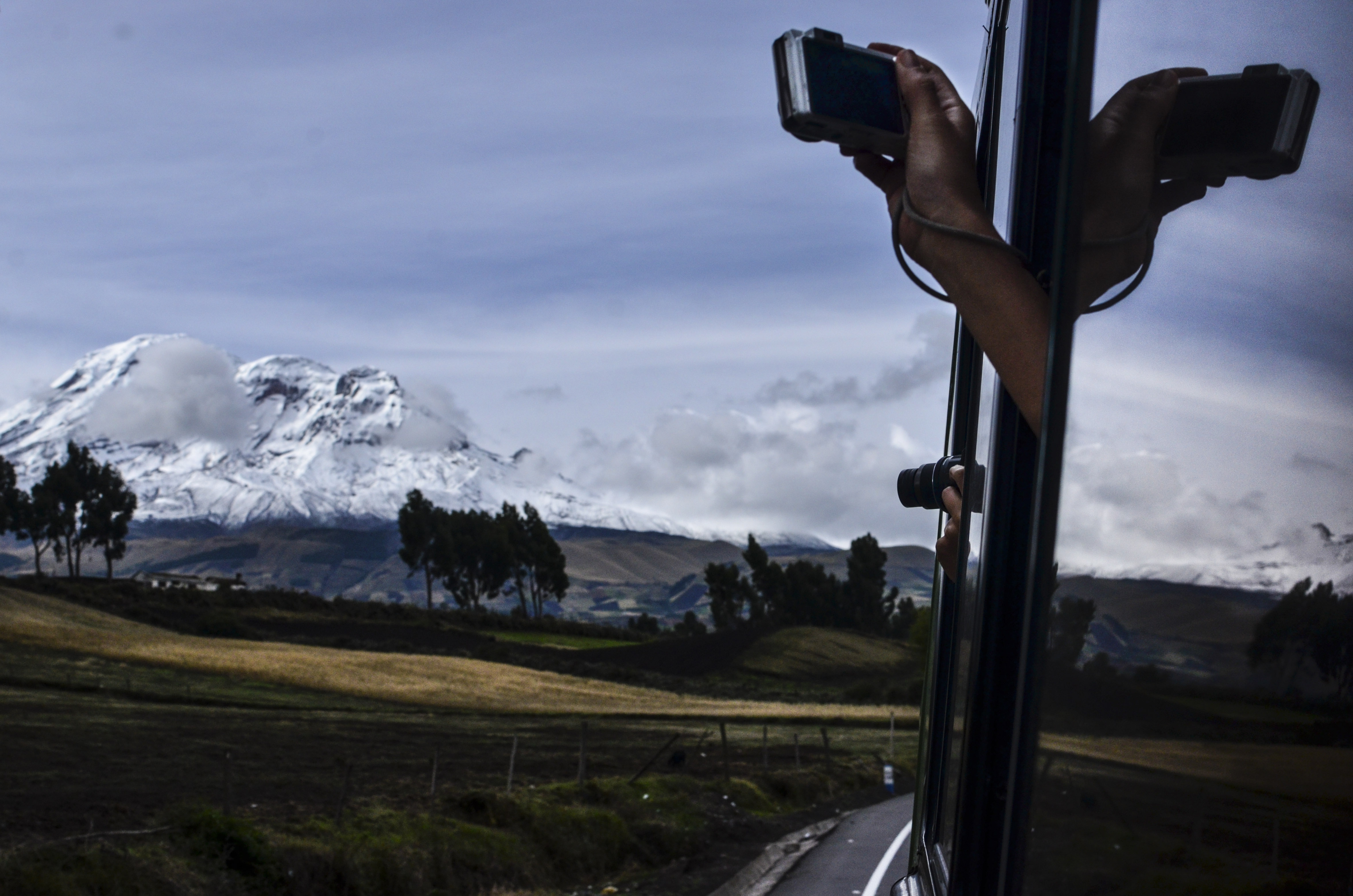 The ride from Baños to Riobamba is a memory that has secured a permanent parcel of real estate in my brain. The jungle-like terrain of Baños disappeared from our field of vision and was quickly replaced by rolling green hills & dark, bold clouds occasionally gutted by the luminous sunshine in the crisp high mountain air. The occasional farm would poke it’s head out from the earth long enough us to get a glance before it disappeared from our lives forever. At that moment we were approaching month 9 of our journey and we had been intimately intertwined with mountainous landscapes for quite some time. They had become somewhat normalized as part of our surroundings, which made it more of an effort to be impressed by the endless supply of beautiful peaks & valleys wherever we looked. We had been getting a little mountained out, which I can assure you is a real possibility during lengthy encounters with the sheer volume of South American ranges. This particular day broke us away from that feeling. I forget who noticed it first, but one pair of our eyes focused on something that did not fit in with the rest of the picture. The enormous white peak of Chimborazo was suddenly there, sugar coated in snow and slightly shrouded with clouds. It rose almost straight up out of the ground and and stood still as the landscape in the foreground shifted at a constantly at a tremendous pace. I watched the snow blowing in slow motion off it’s peaks, blending into the fluffy white clouds passing by. I was awestruck. In comparison the larger than life chunk of earth was stoically biding it’s time while we all superfluously raced through life from one place to the next. While the land immediately in front of us accelerated past our eyes the eastern face of the enormous volcano sat forever still, far off in the distance with no obligations to be had.
