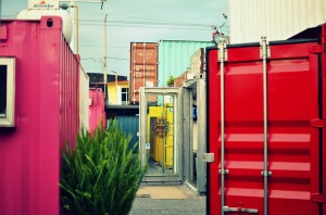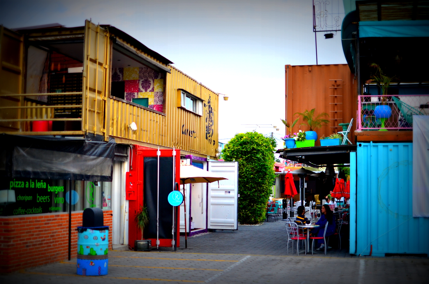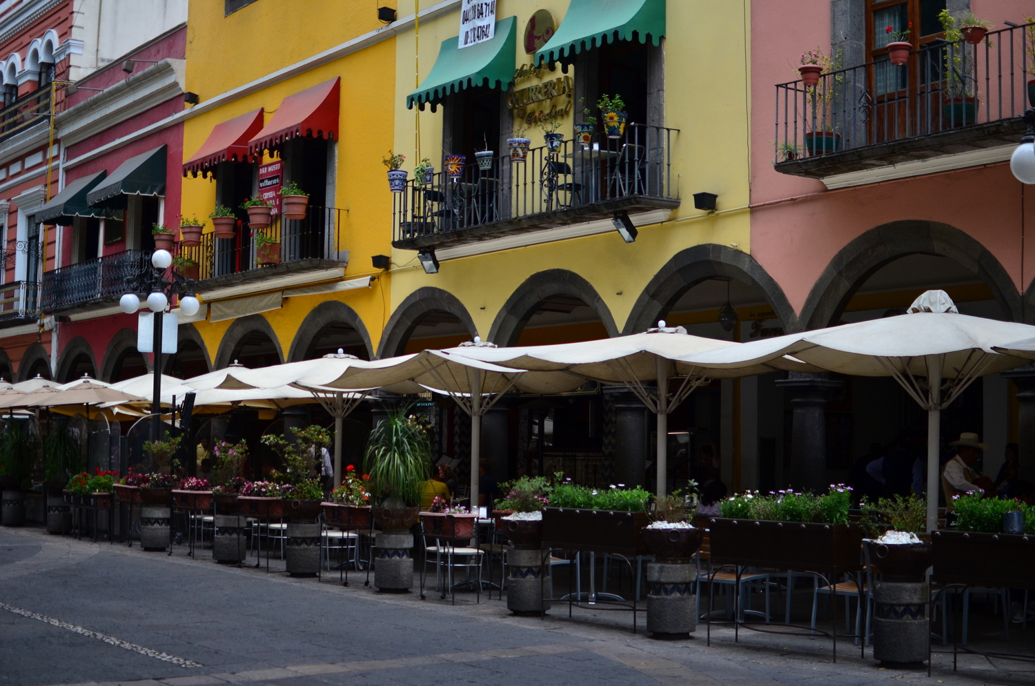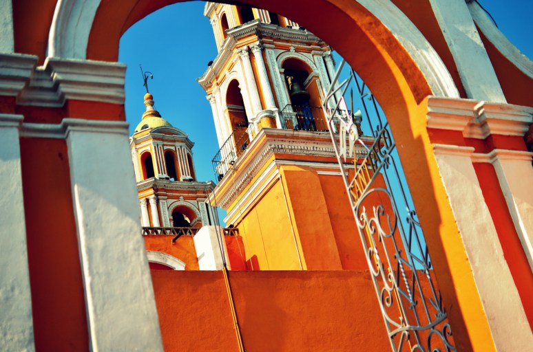 We came to Cholula particularily to see Container City, a small complex comprised of steel shipping cargo boxes made into a small network of stackable bars, stores, and public spaces geared towards the local college crowd.  We snapped some pictures and explored around the brightly colored boxes before heading back for some food and libations.  Our hotel/bar was decorated with vintage pictures of Marilyn Monroe amongst  Mexican beer ads of yesteryear and happened to serve some great ice-cold Micheladas.  Two old men chatted over a newspaper at the bar while we drank our beer with cacahuates.  We took a stroll later on throughout the plaza during a soft rainstorm (a pleasant treat from the endless sunny, dry days) surrounded by beautifully lit cathedrals and restaurants.  Cholula has the largest pyramid base in Mexico (by volume) and it was a short walk away from our accomodations.  In the morning we found out that the ancient tunnels were permanently closed and had collapsed recently.  As a concession we settled on some fresh fruit with yogurt before taking a very authentic bus ride to Puebla.  I can honestly say I’ve been off-roading on a public bus now.
