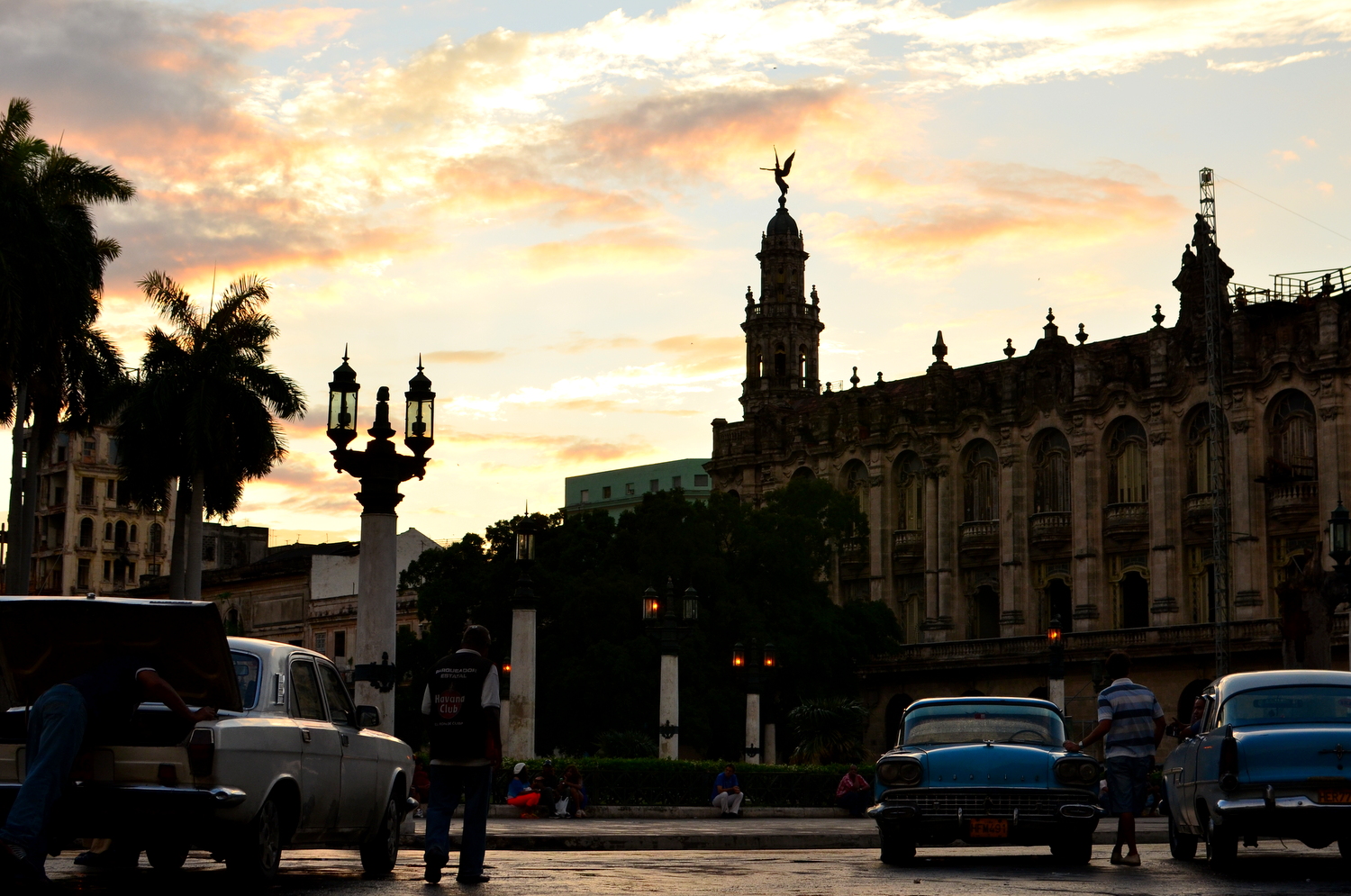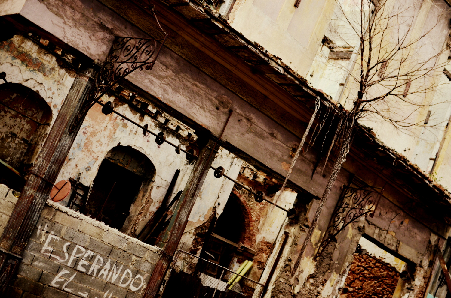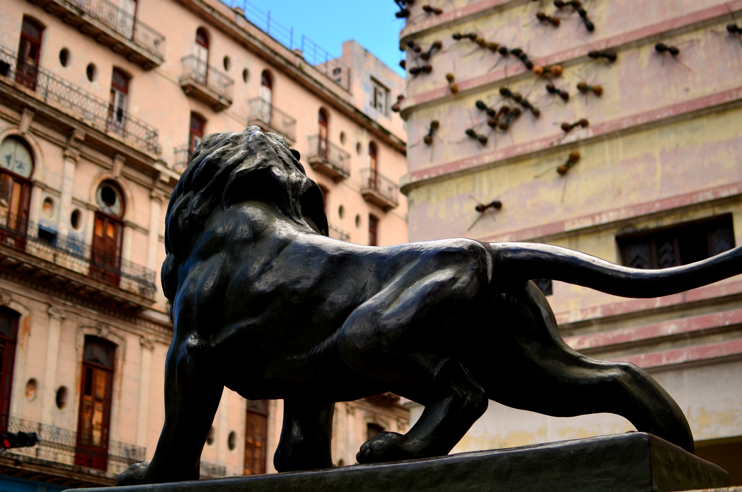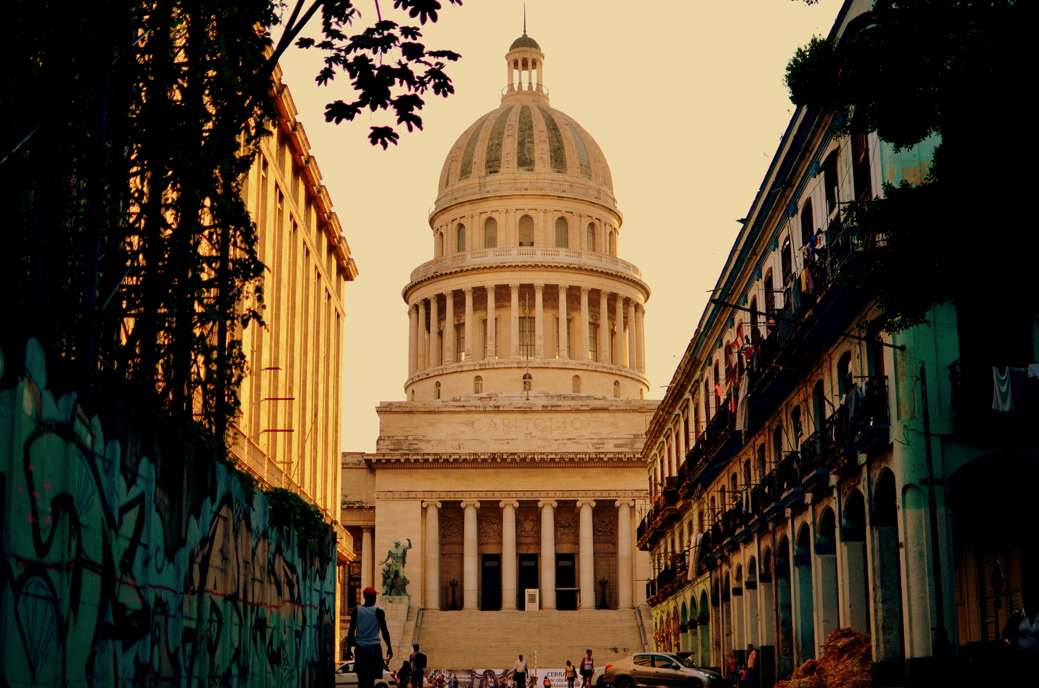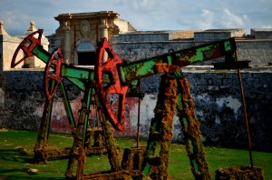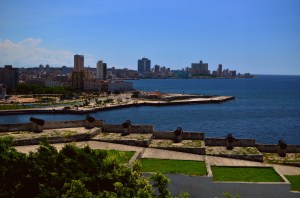 We made it part of our duty to see the massive display of artwork the Bienal was showcasing at the Castillo on the other side of Habana’s harbor.  The Castillo is a war fort of the past (built in the 1700’s) complete with massive cannons aimed towards the city, moats protecting it’s foundation, and giant limestone blocks reinforcing it’s outer skin.  This was a very unique setting for a modern day art exhibition.  The Cuban art scene consists of an otherworldly talented pool of highly skilled artists who produce amazing pieces ranging from paintings, drawings, photography, videography, collages, metal works, pottery, and conceptual.  We spent hours wandering the fort in the hot heat while the artists themselves were hanging out in their designated spaces chatting to anyone who wanted to talk about anything.  One  unique installation consisted of an entire hollowed out palm tree with light bulbs inserted into it’s trunk in an otherwise pitch black empty room.  The roof of the castle was not roped off so I naturally climbed up for a bird’s eye view of the city and the horizon lines. When we got back into town we took a guided tour through the Teatro Nacional, Cuba’s gorgeous, otherworldly home for theatre, ballet, and dance performances.  Exploring through the grandiose architecture was a definite trip worth every penny.  The tour took us through old rooms with workers repairing chandeliers and fixtures, libraries and study rooms, and right in front of a practice room filled with dozens of performers training in class.  We could only catch a tiny glimpse of what was going on through a tiny rectangle where clouded glass used to be, watching dancers jump, move, and pose with the soundtrack of 40 feet stomping in a choreographed unison. The thunderous noise echoing off the walls boomed right through our bodies as we listened and imagined what it really looked like on the other side of the portal.