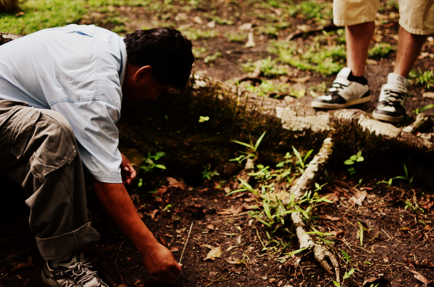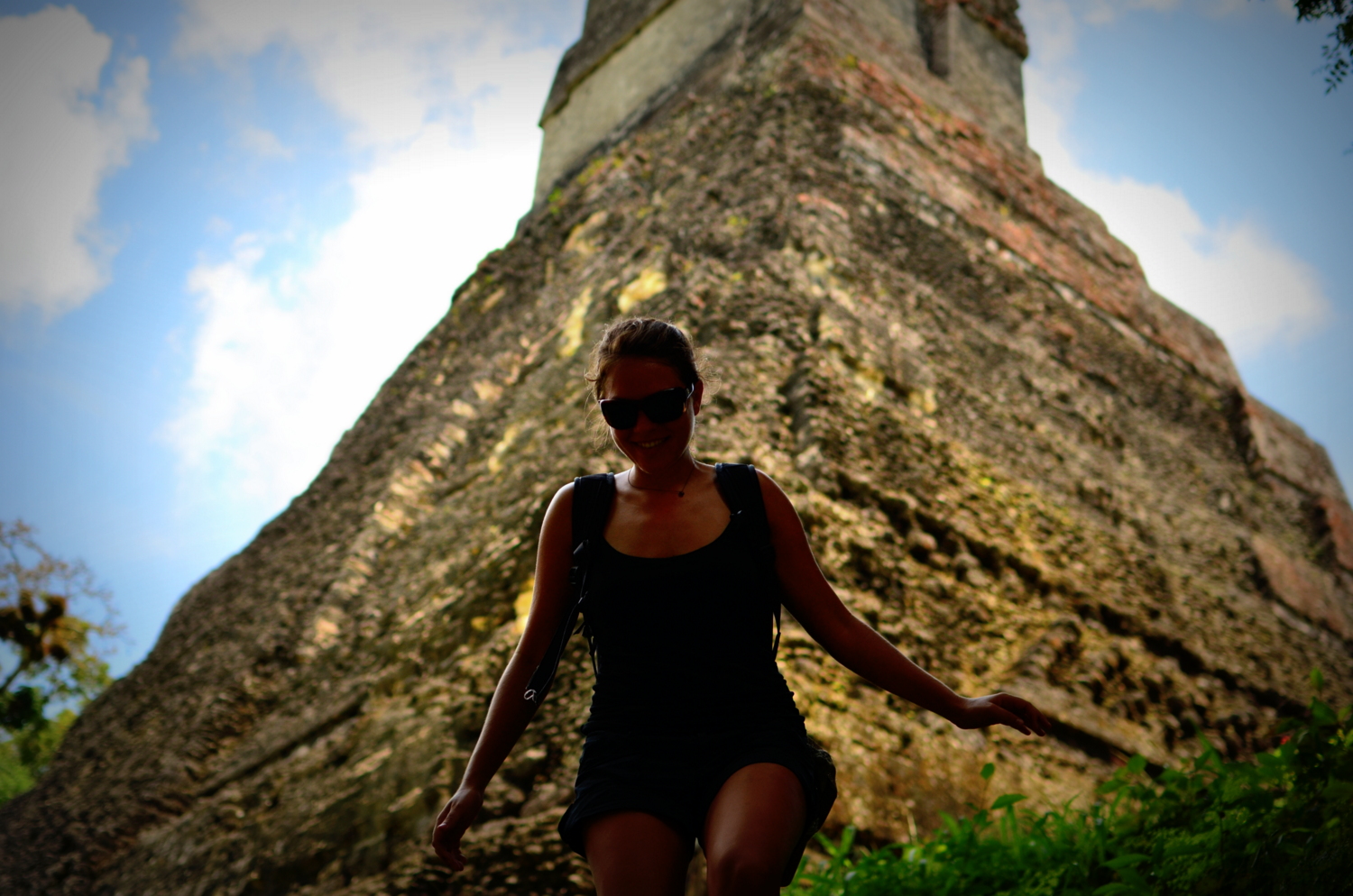 After arriving at Tikal we followed the tour for a bit while our guide explained some background on these ruins.  He lured out his 10 legged “friend” from a hole at the base of a giant Ceiba tree and had us pose with this massive tarantula on our heads, hands, and shoulders.  This man gave Mel Gibson a 2 hour tour when he was doing research for Apocolypto (laughable considering a normal spin around the park will run you at least 3 hours) and seemed to be in love with Sylvester Stallone for his symbolic work in the Rocky series.  I have been noticing that this has been a common theme in central America, and almost weekly we come across a TV beaming the Italian Stallion.  Tikal itself breaks down to place of voices, and this is very apparent when you play with the acoustics of the triangulated structures.  Priests used to stand on top while people below listened to their naturally amplified vocals created from the positioning of structures and the composition of the stone.  Clap halfway between the buildings and you will be surprised to hear the noise that results.