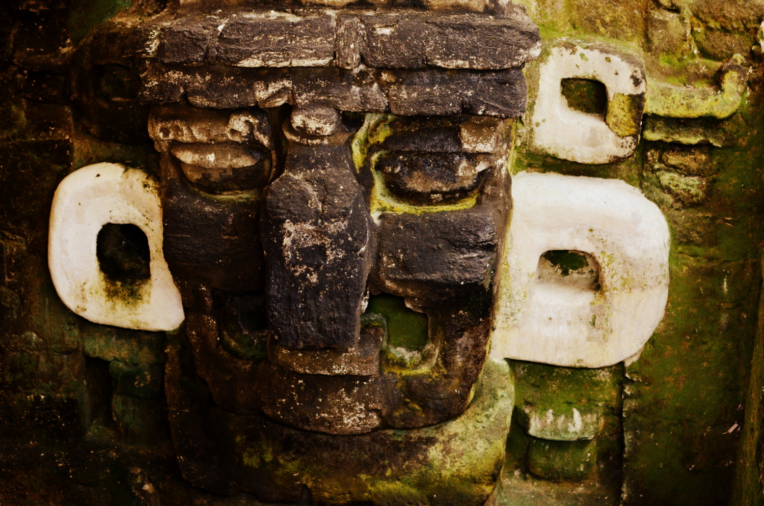 An hour or so of following the tour we began desperately trying to find a moment to break away.  This was partly because tours are too structured but mainly because we didn’t pay and knew he was trying to rope us in for the entire lecture and expect payment at the end.  Soon a fork in the path presented itself and off we went.  Wandering around the park we were in the thick of the Guatemalan jungle amidst spider monkeys, lizards, frogs, huge insects, and finally Tucans (we had been trying to spot these for weeks now)!  We went straight for templo 4, one of the taller and better vantage points to see the jungle canopy and the tops of the other buildings.  After climbing the cartoon-like steep wooden stairs built to preserve the ruins during the excavation process we fell into an instant meditation once our eyes were casting their gaze on the panoramic view from above.  For a good 10 minutes it was just us and this amazingly surreal vista.  Then about 50 Guatemalan children in some sort of school group came flooding in and we made our retreat.  We ventured over to the central plaza and stood amongst the infamous temples.   There we explored small structures housing perfectly preserved Mayan larger-than-life face sculptures before heading for the gate.  Tikal was everything we imagined it to be and we needed to catch the bus or we would have to wait out another 4 hours in the intense heat.  An oven-like midday bus brought us back into Flores fully cooked.