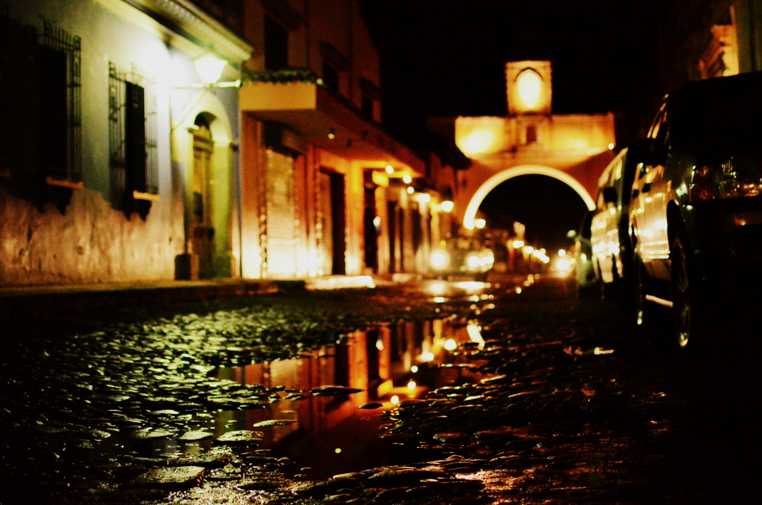 San Pedro was left behind with a little more Spanish under our belts, more memories tucked away, and a hell of a shuttle ride out. It rained hard while we tacked up the road leading out of the lake causing small streams and rivers to form along the asphalt edges. We were sad to leave but excited to see what Antigua held behind it’s name. A seriously last minute airfare deal (4 days prior) pursuaded Elissa to fly her mom out to Guatemala for a week to join us in our journey. The thought of backpacking around with your girlfriend’s mother in a developing country would more often than not cause quite a stir. We, however, could not have been more excited. This was the first time in our journey where someone we knew and loved would be traipsing around with us, seeing and experiencing the adventure first hand. Naturally, we felt the pressure to come up with a solid plan. Our ride dropped us off in the cobblestone streets of the picture frame perfect spread of colonial Antigua. After an hour of backpacking around town trying to find the perfect place for a few days con mama, we gave up and put our bags down at some random hostel. The wet cobbles glistened and the puddles in the streets mirrored the abundance of lighting and ancient buildings. Photographic instincts kicked in and an initial night walk and shoot followed.
