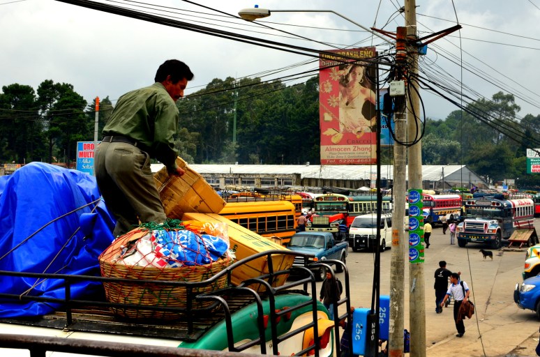 Up until this point we did not try out a chicken bus. I knew that a Guatemalan trip would never be complete without taking a decked out, 1980’s Blue Bird school bus for transportation. Xela was were we met our first chicken bus ride. A quick ride on a city shuttle taught us to keep our eyes close to our valuables. A woman saw me snap a picture with my iPhone and told me to put it away and be careful. After we were dropped off in the outskirts of the mercado we went over some basic street smart guidelines with Caryn. The other sides of Guatemala, the 70% or so that live below the poverty line, was all around us. As we walked single file through the fringe of the mercado we realized that our route was going to carry us right into it’s heart. We were offered everything under the sun on our march to the station. Boxes of live chickens, corn on the cob, tomatoes, razor blades, shoes, belts, hats, deodorant, radios, sunglasses, melons, bananas, pants, boots, water, and ice cream were all at our disposal. I was about a solid foot-and-a-half taller than every living thing around us as we made our way through the maze of elderly Guatemalan sirens chanting out the commodities they had to sell. Women that looked older than the land itself were planted firmly on the ground vending food as they probably have been doing their whole lives. I kept an eye on Elissa and the other on Caryn as we made our way through the buildings towards the light of the bus station. When we breached the mercado it almost felt more secure to be back in there than the pure and utter chaos of a second-class bus station in Guatemala. Luckily a man quickly spotted us and guided us to the bus we were looking for, free of charge. I think these buses are privately run because the ultimate goal is to get as many passengers in it as physically and humanly possible. Forget about getting comfortable on a chicken bus, it’s not meant to be. Before our bus took off I climbed up on the roof to get a picture of the bus station from above. Shortly after two men began placing large portions of sheet metal roofing on top, nearly killing one of the helpers when a piece fell down. All of these details did not ease the maternal mind of Caryn and how her daughter and boyfriend are getting around in developing countries.