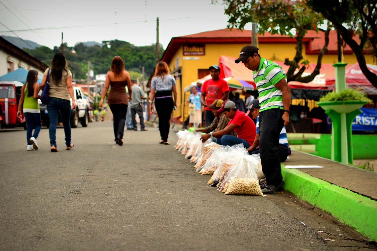On Saturday the weather was dark, grey, and smelled like barbecue. The long tents had become loaded with chairs, tables, cooking stations, and charcoal pits. The quaintly slow and quiet town had turned into a Latin American festival overnight. Men selling every kind of nut imaginable lined the sidewalks in front of the church. Each vendor under the tents were almost rubbing shoulders with their neighbor while grilling up gigantic shrimp, chicken, beef, chorizo, and sausages. Whole fish were frying in hot oil while soups simmered over cherry red coals. With a bit of luck you could procure a table to eat on and the stall you placed an order with would find you when your dish was ready. Right after we inhaled pork ribs the sky opened up, resulting in a huge influx of bodies into the tents. Tables became extinct while quarter sized rain drops killed any inclination to go anywhere. But that doesn’t mean we stopped drinking special fruit blended apple drinks and eating paella. Performers sang renditions of popular Latin tunes and held their audience captive while a soccer match was aired on a plasma screen TV duck-taped to cardboard boxes. The rain was relentless but eventually decided it had done enough. We took a 20 minute tractor/train trolley tour of the town and were not surprised to find out they had barely anything to point out.