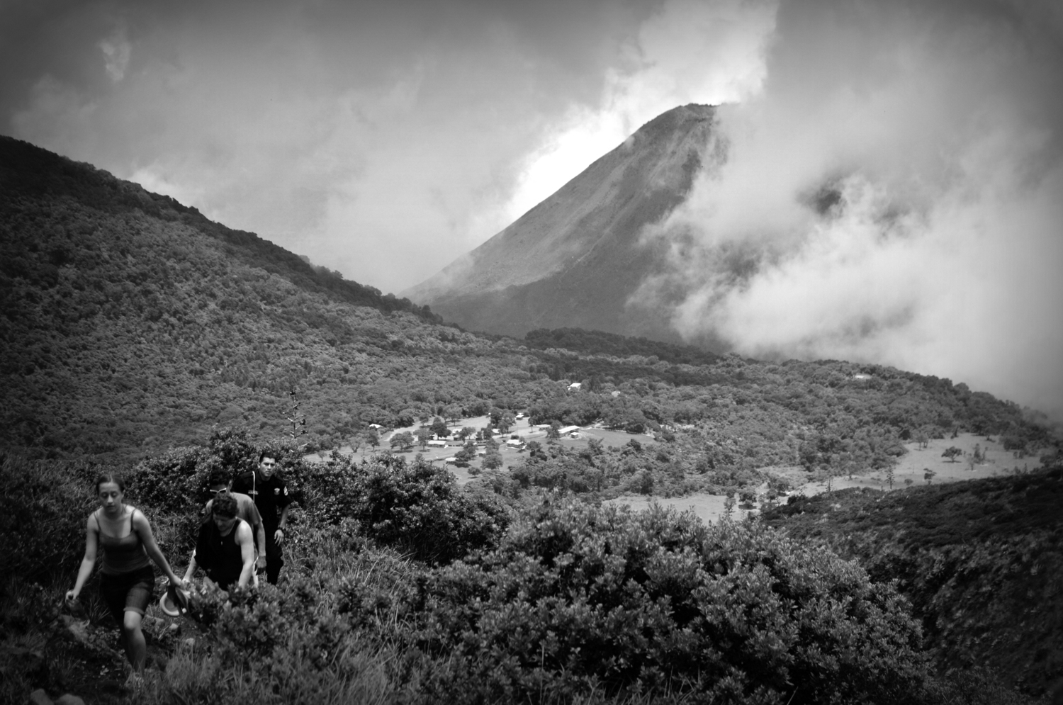 The next morning we followed these new instructions and hit the road at 7:30 on a bus destined for the park.  We teamed up with about a dozen or so others and were escorted by a police detail in the front and the back.  Tours in El Salvador tend to have men with big guns on your side.  This is a surprisingly refreshing feeling as a traveler because it brings another taste to your tongue.  It writes a different story, puts new colors onto the canvas of cultural differences between the growing encyclopedia of countries your feet have been walking through.  The police detail also kept quite a pace. We huffed and puffed as we tramped through the forest, up through fields, past the trees, and into the volcanic landscape.  Other cones were in the close distance while odd looking plants stretched far up into the sky.  Clouds skimmed the surface up the side of the cone and blanketed over the top as we approached the summit.  A cool layer of vapor collected on every part of your exposed skin as visibility became more opaque.