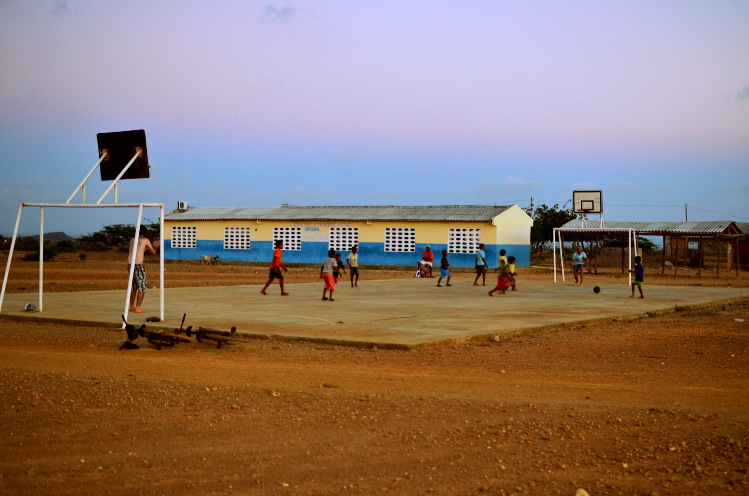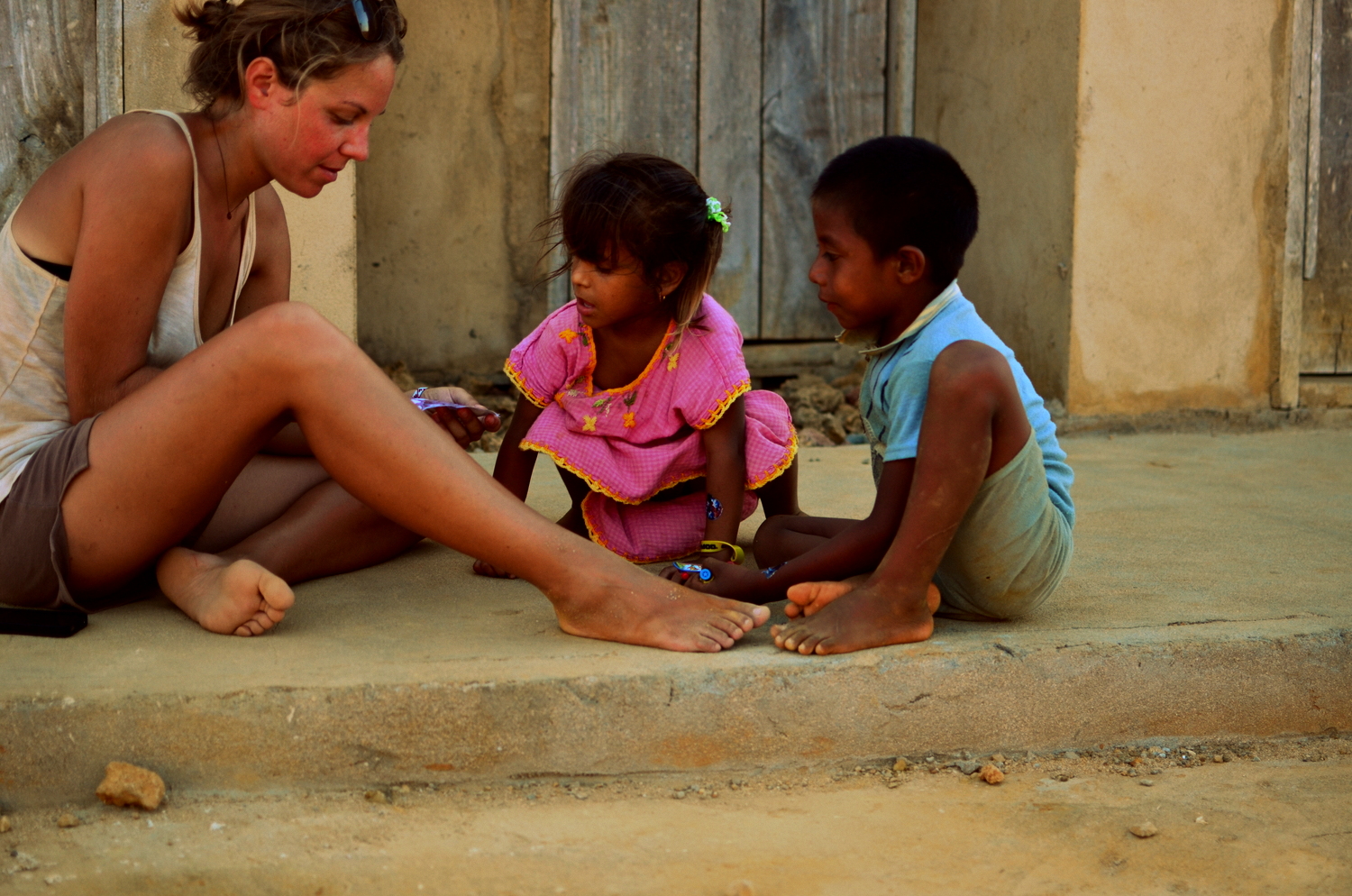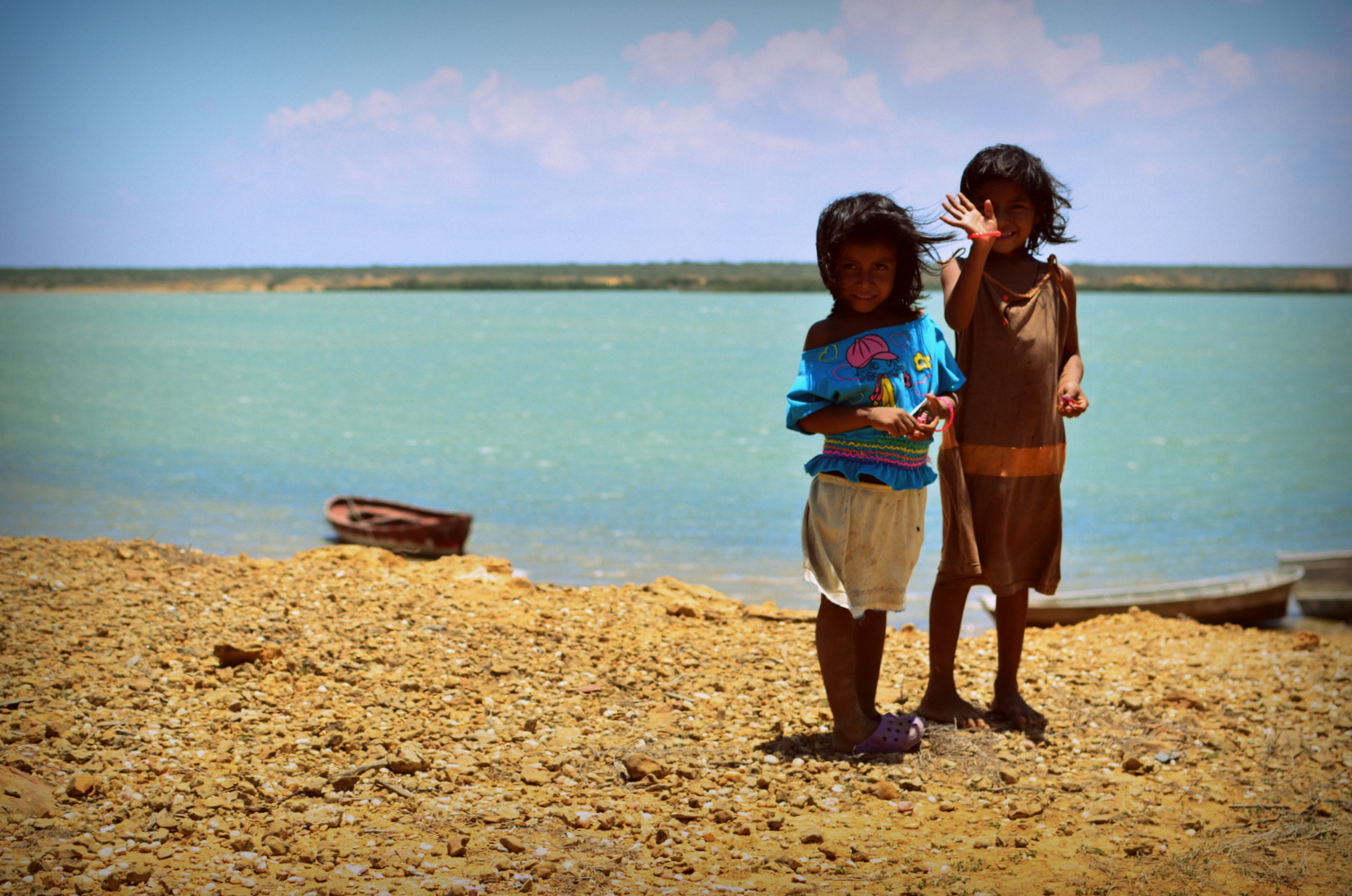Although our departure from Santa Marta, Colombia came just as we’d sent our first sum of donations to Guatemala, our destination called for Penny Karma. From what we’d read, Punta Gallinas was a surreal headland at the most northern tip of the entire continent. The blogs we’d scoured for travel tips were full of awed accounts of a lawless paradise where the desert meets the Caribbean Sea. Situated on the tip of the Guijiara Peninsula, this area can only be defined as remote. It took 2 days worth of buses, vans, 4×4 trucks, and boats to reach this isolated desert community. The voyage there was spent shoulder to shoulder with locals, hitching the same ride North. Sometimes this entails a 4 hour ride on the back of a pick up truck stuffed with 2 dozen bags of cement, 55 gallon drums, huge sacks of sugar, and about 10 Wayuu women and children under the hot desert sun. We handed out our first few gifts on the roughest stretch of desert road to three wide-eyed Wayuu kids who passed the stickers between themselves glancing up at us and their parents as we bounced down the dusty unpaved road.