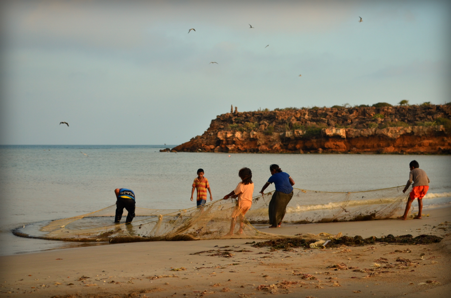 The people who call Punta Gallinas home are Wayuu Indians, a resilient group of natives who refused to give way to Spanish colonization and who to this day are well known for their strength. Prior research enlightened us to how separated from the entire world the inhabitants are. Our Lonely Planet guide suggested bringing candy for the kids that sometimes set up friendly road blocks for candy tariffs. Thinking about what life must be like being that distant from modern life, Elissa thought it would be fitting to bring a bunch of toys, stickers, and pencils for the kids to enjoy. When we finally arrived, we saw just how isolated their existence truly is from the rest of the world. Electricity is only available if families have enough money to buy gasoline for their generators, and running water is nonexistent. The blazing hot sun makes life stand still by midday, minus the goats, cows, and pigs all scrounging for the little food around. After returning from early morning fishing trips, Wayuu families spend their time preparing food and hiding from the sun in their hammock strewn homes.