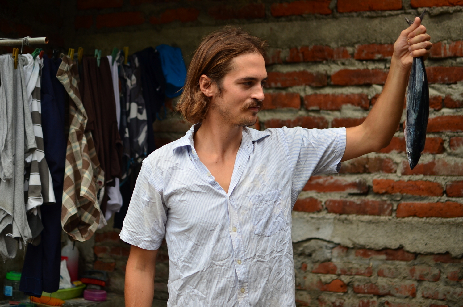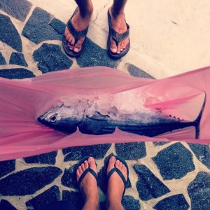Since we were back on the coast we both wanted our toes to soak in the salty ocean once again.  We made our way to the beach’s tranquil cove, which was stunningly sheltered by two massive headlands, and ran into the warm, gentle surf.  Within 20 seconds I felt a very sharp pang in my foot, and realized that I had stepped on a small stingray.  Blood came pouring out of a tiny incision in my right foot and eventually began throbbing with every step/heartbeat/breath.  Foiled again.  I limped back to our house, but not before buying an entire Tuna for 2 dollars.
