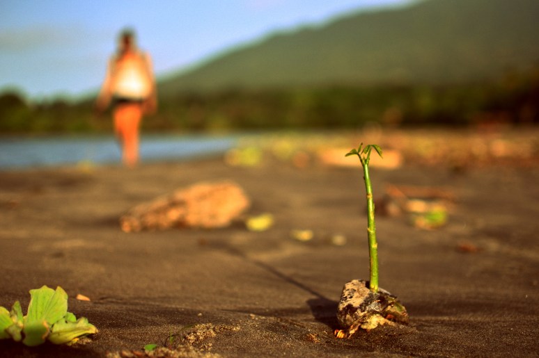 After getting settled we walked to the empty beach nearby for some afternoon sun. This little stretch of shore offered up stunning views of both volcano peaks (a rarity this time of year) for our eyes to feast on. It turns out that a wide lake beach with a volcano on each end can provide hours of entertainment! Tiny bushy plants were sprouting up everywhere in the sand while miniature waves crashed on the shores edge. We left just in time to catch a sunset that silhouetted Concepcion, the larger of the two volcanoes, and eyed it inquisitively from the lookout tower perched on top of the hostel property later that night.