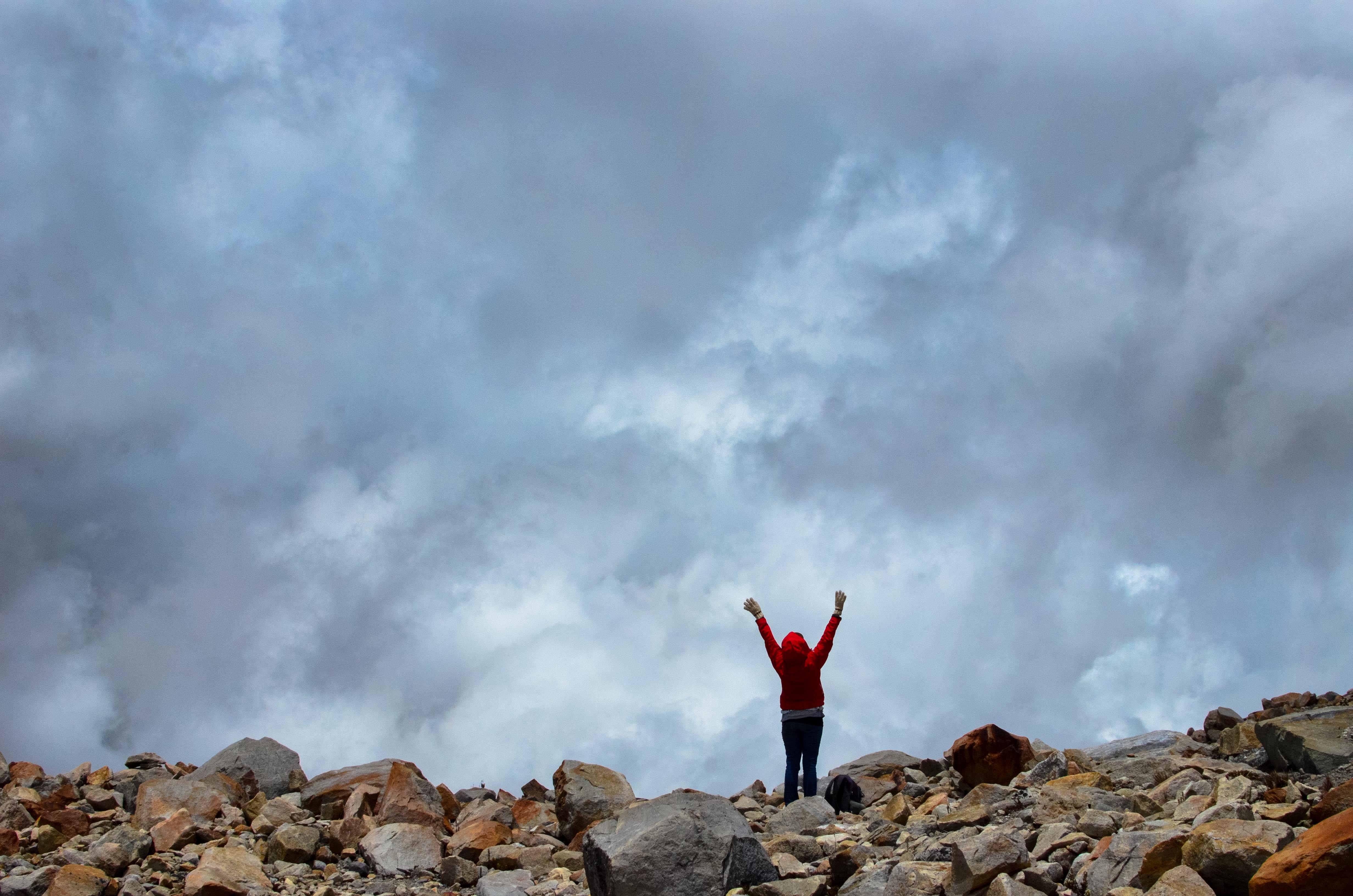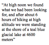 effortless and happy) the trail would keep going up into nothingness. Our fearless dogs disappeared over one of the ridges and we figured that was the last we’d see them. We ascended for hours, and the weather turned from warm sun in the valley to hail, wind, and rain on the ridge. We poncho-ed up and threw on gloves and hats and pressed breathlessly onwards. Our goal was a glacial lagoon at the trailhead leading up into the glaciers. It felt like we would never make it. Up and up we went, with each crest holding the promise of a lake on the other side. The landscape shifted from plants, shrubs, and flowers to just plain boulders and gravel. Looking back down into the valley felt like we were miles from where we started (probably true). The clouds soon made everything disappear and gave us the true feeling of being out there. At high noon we found what we had been looking for, and after about 6 hours of hiking at high altitude we were standing at the shore of a teal blue glacial lake at 4600 meters. The raw earth was kept warm in blue colored glacier blankets with glimpses of the infamous land marks poking out through the clouds. It was truly a sight to see in person, but it was even more rewarding because of the efforts to get there.