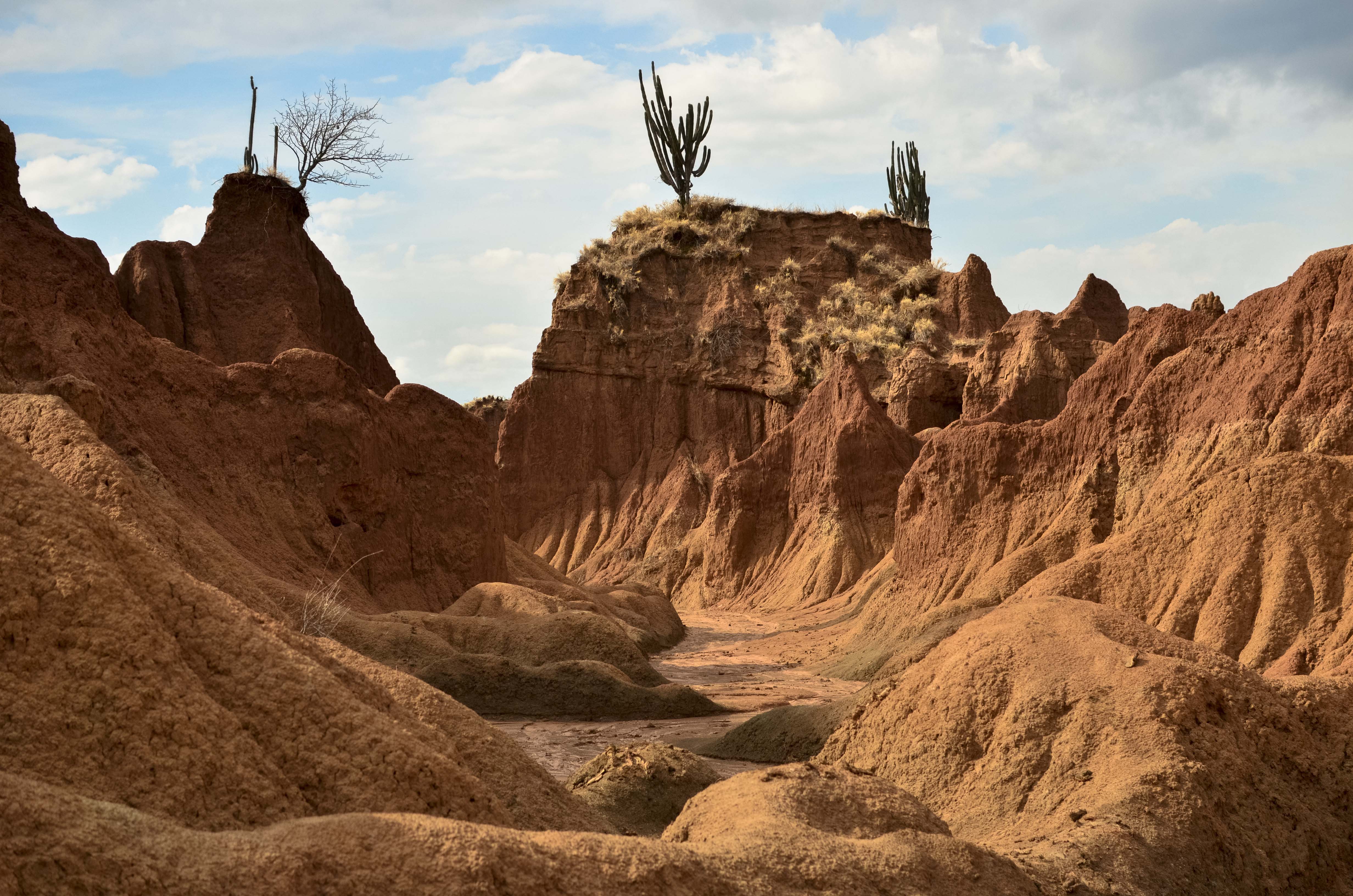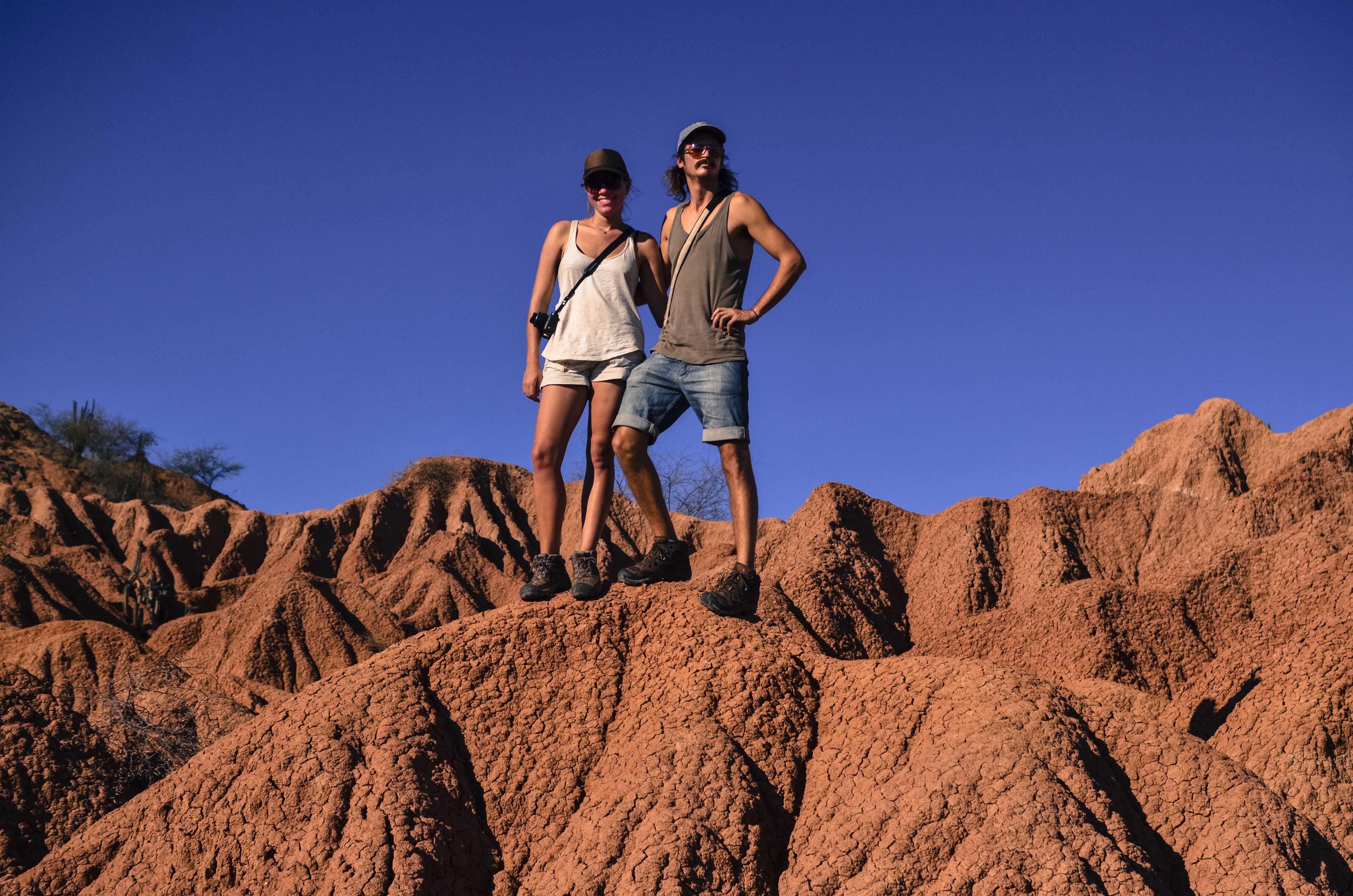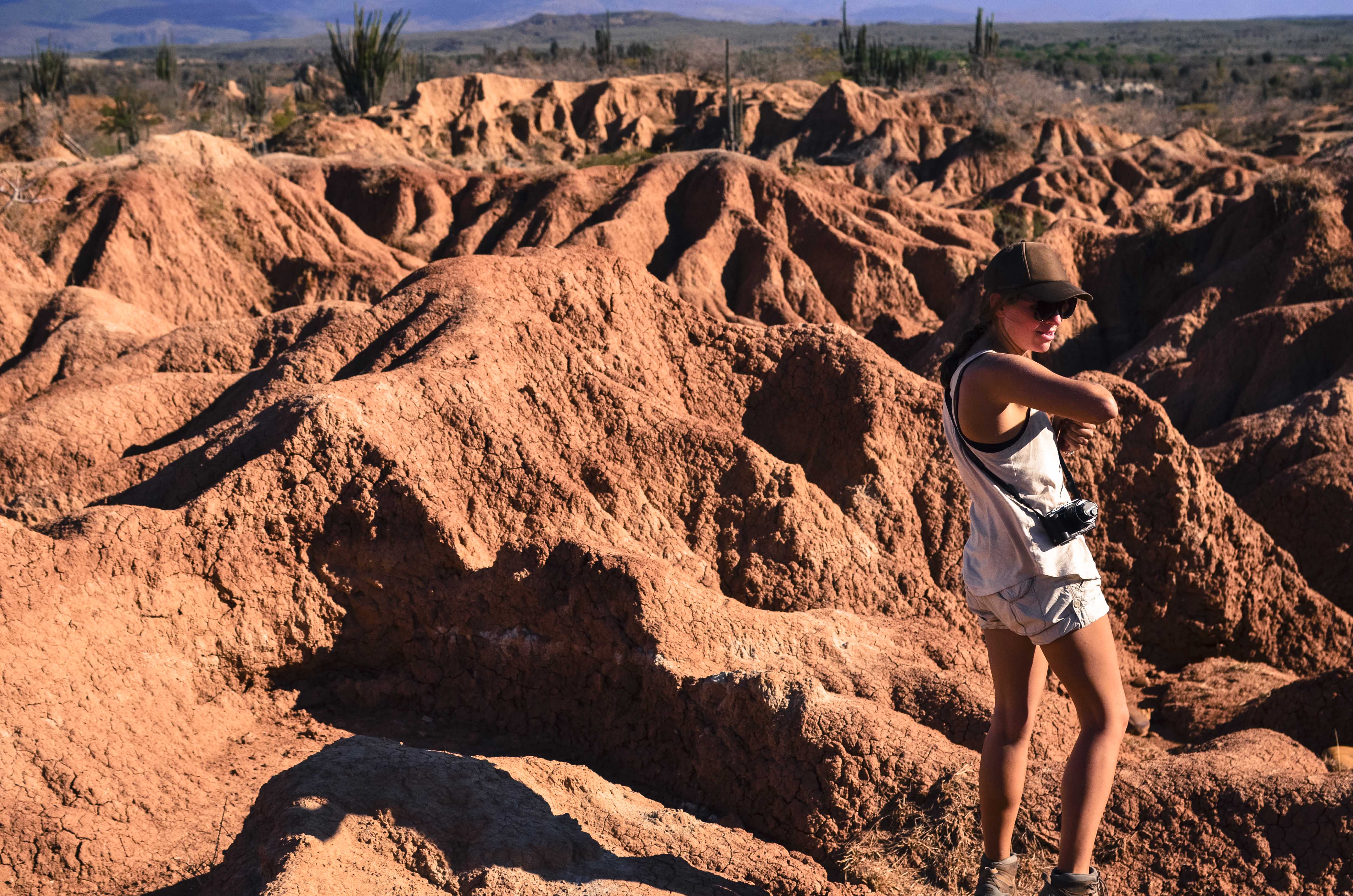 Just one bus ride away from the fertile, green mountainous region of the Zona Cafetera exists Desierto Tatacoa.  Wanderlust, along with the primal need to continue, helped us to leave behind the supremely relaxing vibe of our hillside farm hostel and go straight into the dry, hot air of Colombia’s 2nd largest arid region (the 1st being the Guajira Peninsula).  This region behaves by any normal standards as a desert, but is technically a tropical dry forest.  Fossils have helped geologists realize that the area used to be home to plants, flowers, and trees that have gradually been dried out, giving way to cacti and other desert plants that can survive in the extreme heat and lack of natural precipitation.  This change in the climate was noticed immediately as we descended down from the cool, temperate mountains and found ourselves in vast flat, rust colored valleys with silent red and gray mountain peaks on the horizon.