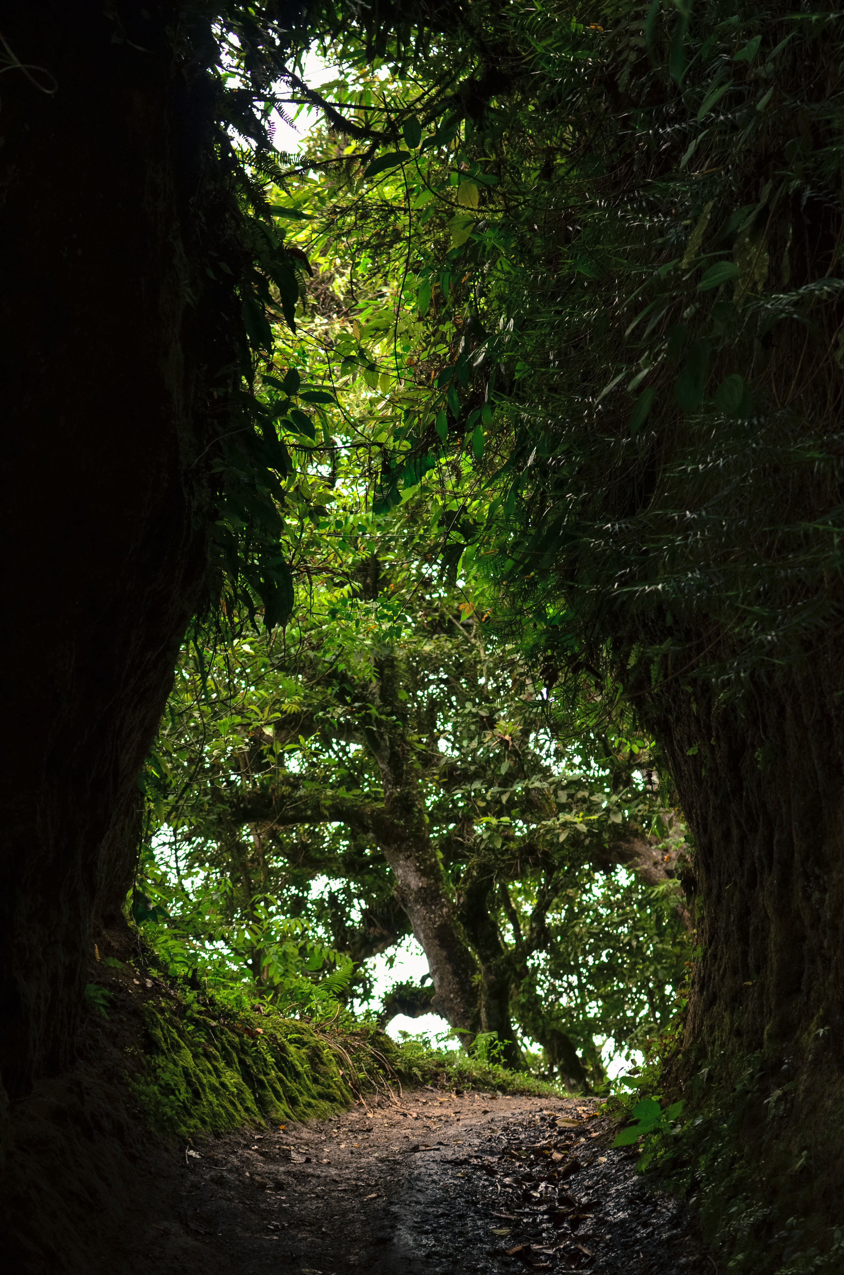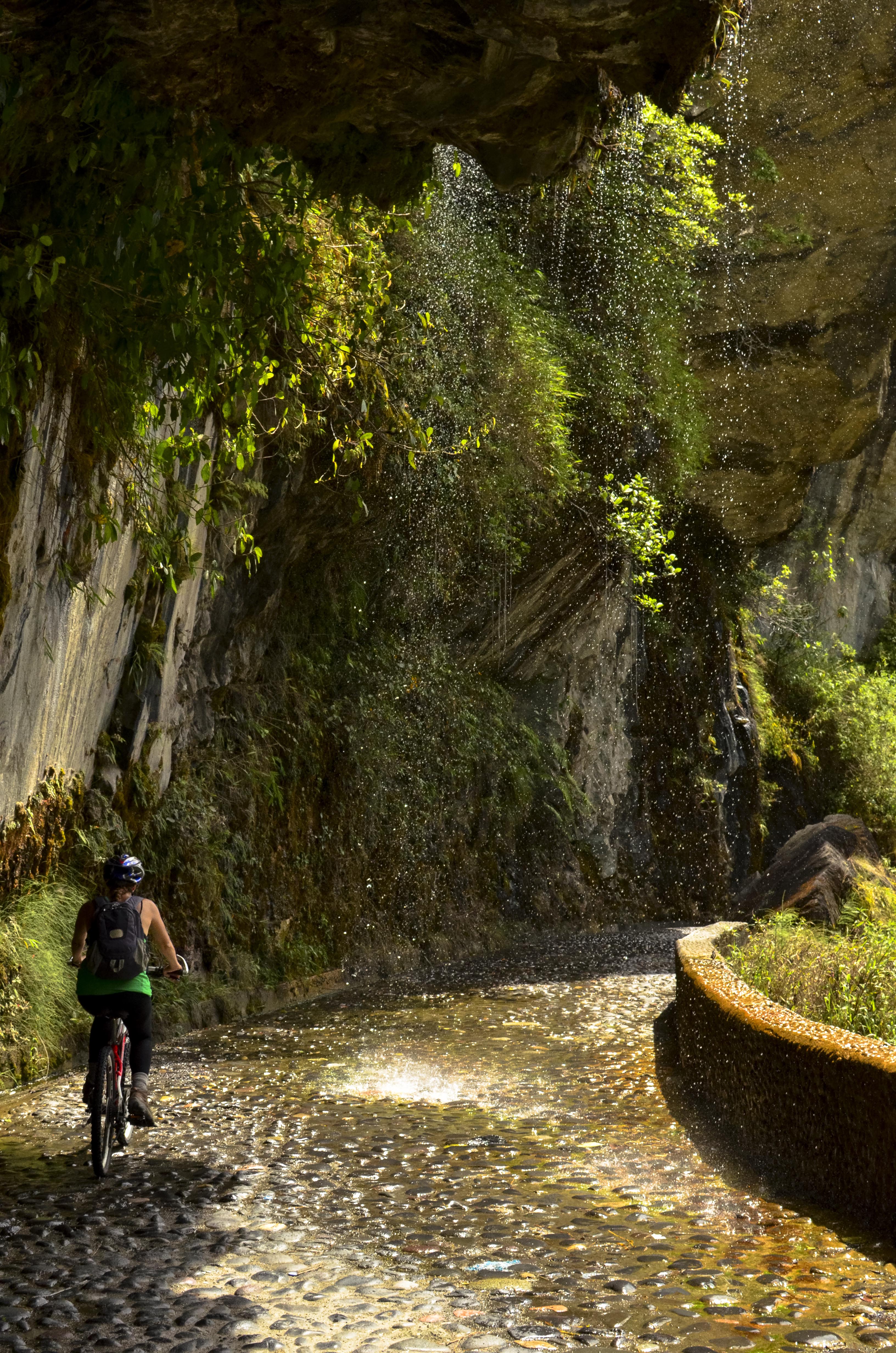 On one of our last days in Baños we chose to hire some bikes, get out of town, and explore the statuesque valley below. We biked along the only road that led out of town along the edge of the river, hugging the skinny shoulder on a long, gentle decline.  Little gatherings of houses and streets would occasionally come and go as we whizzed by on inflated rubber tires, enjoying all the primitive and simple pleasures of the ride. Occasionally there would be pull off along the gorge to showcase an impressive waterfall and panoramic views. There was usually some sort of business catering to adventure tourism demand at these stops, typically ranging from paying money to climb up a tall tower for a better view, zip lining along the gorge, zip lining across the gorge, bridge jumping above the gorge, paying for a gondola ride across the gorge, or restaurants with a view of the gorge.  The road had been cut through portions of the tall, solid wedges of rock, forming a tunnel out the other side.  Usually a few hundred feet before the tunnel entrance a small bike lane would veer off to the side, hugging the contours of the valley walls.  These side paths seemed like the used to be the original road before lots of traffic came to the region, and were comprised of mostly hand placed brick and concrete walls.  This zig-zaggy path led us to all sorts of surprises, and some beautiful curves that would take us underneath chunks of cantilevered bedrock dripping with groundwater and hanging plants.  We took it all in and kept soaking in the views as we went further and further down in elevation along chocolate colored river below.