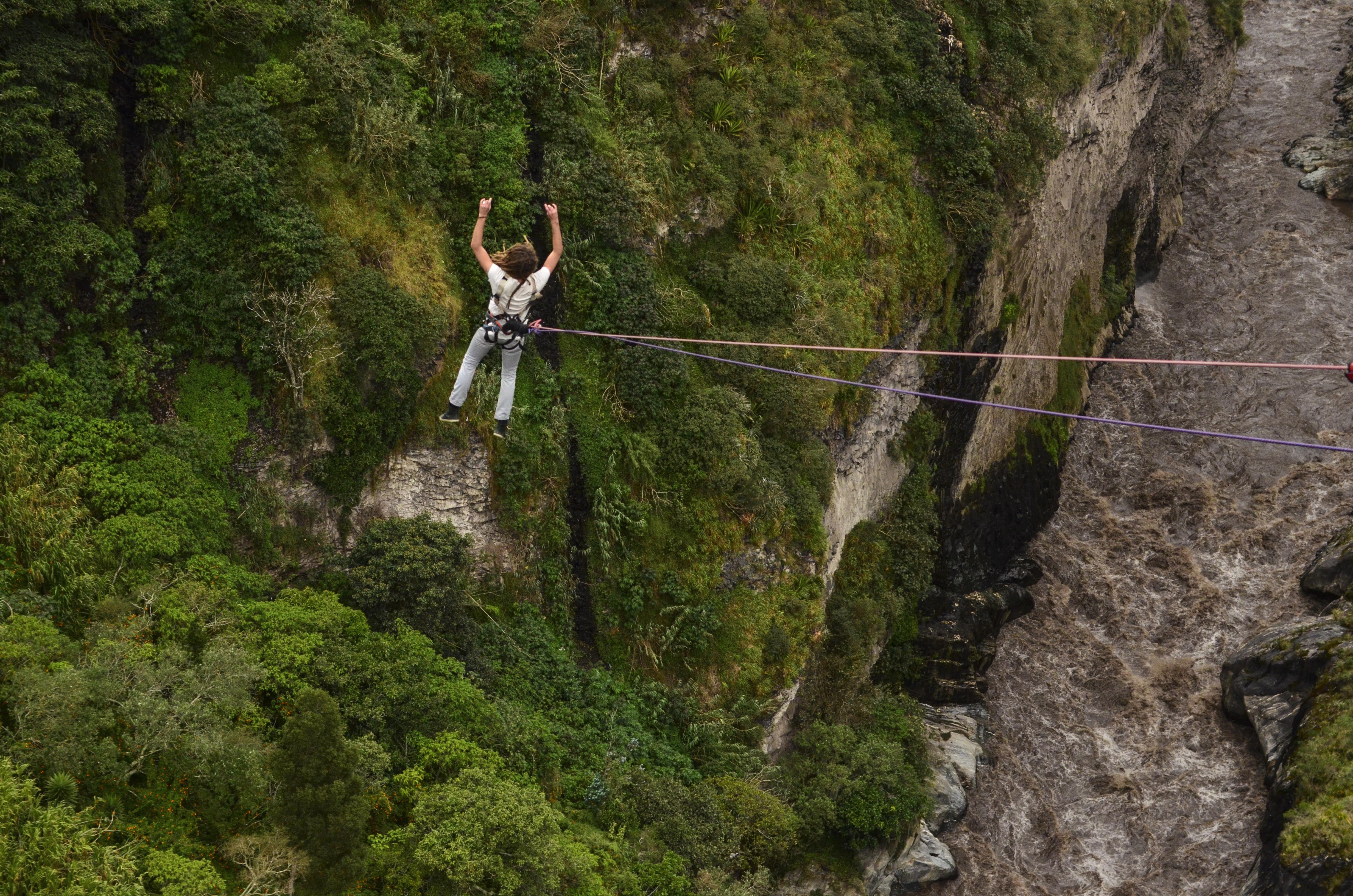 After our spin at the hot baths, we wandered around town a bit more to see what else was going on.  We heard from some travelers that there was a bridge jumping business near the bus station, and that sometime in the afternoon there were going to be some tourists trying it out. When we showed up to the bridge, sure enough there were some guys with a group of girls in the middle of the bridge fastening harnesses and giving out instructions.  We took a walk down a path that seemed to go underneath the bridge, which was probably around 150 feet above the churning river below, to get a better vantage point of the jumpers.  One by one we watched a few jumpers go, and snapped some pictures of them swinging under the steel bridge.  I grabbed a few good images and figured I’d walk up and ask if they wanted me to email them to them for souvenirs.  As we spoke with a few of the girls and guys, we turned around to talk with the jumper I just shot images of and to our surprise it was a very familiar face!  Coincidentally, one of the jumpers I took pictures of was a travel buddy named Ilse, a dutch girl we last saw in Colombia when we parted ways near the border.  Small world.