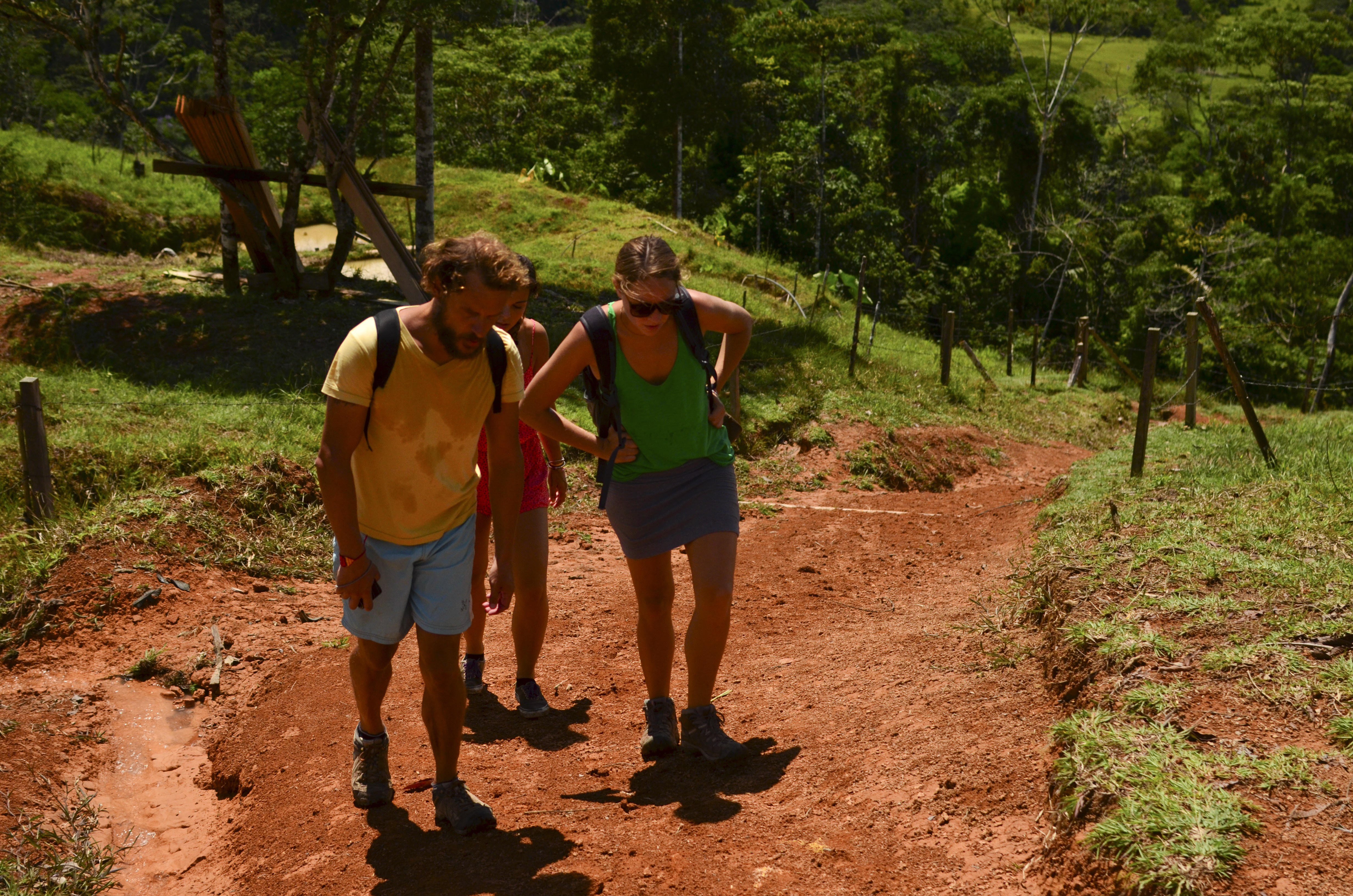 The farm at La Serrana offered gorgeous mountain views that were best enjoyed sipping freshly brewed Colombian coffee and munching on delicious local fruits the land gives it’s lucky visitors. We heard from other travelers who visited the area that a visit to an organic coffee farm named Sachamama was an absolute must . To get to Sachamama we had to memorize vague instructions involving holes in fences, landmarks, paths, bridges, and horse roads. We left with a small group of some other tourists that wanted to check out the farm and began walking down the gravel road away from town. We cut through terraced farm lands, down steep hills, past the occasional house, and into a pristine, almost silent valley with green forests on either side of the blue stream cutting through the middle. Fresh fruit fell from trees along the way, which I never pass up, and sweetened the path to the farm.