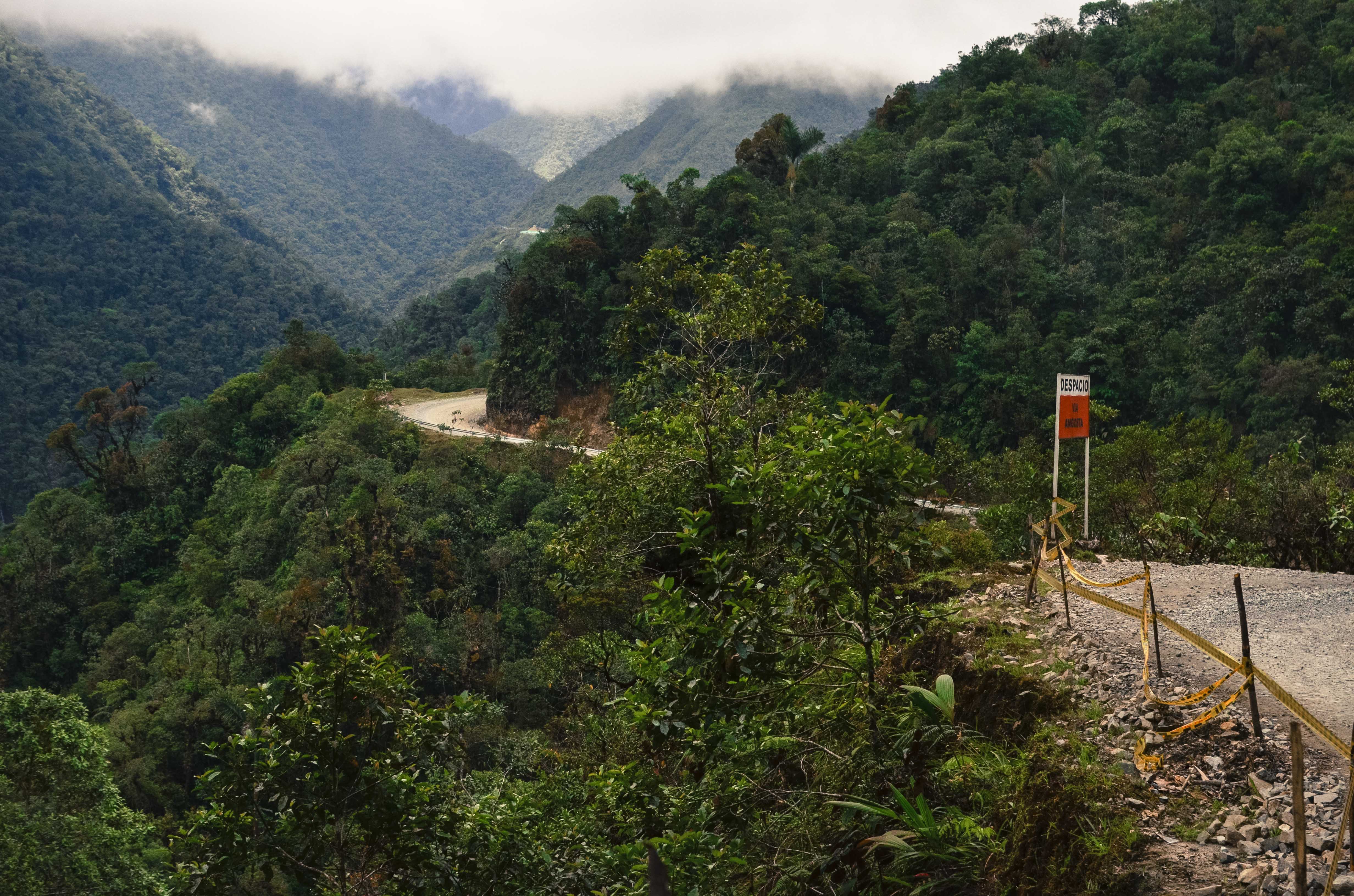 When our truck was ready to take off, they packed us three backpackers in the bed of the pickup truck. It was equipped with hand crafted with wooden benches, a metal frame, and a zippered thick tarp that covered us from elements for the long journey ahead. We took off, leaving a dusty mercado behind us. In front of our pickup truck was a meandering asphalt path ascending into the massive monolith ahead, disappearing and reappearing through the thick green canopy of the mountains. The path we were going on was coined “El Trampolina de la Muerte”, which translates to “The Trampoline of Death”. This road, much like Bolivia’s famed “Death Road”, is known for it’s perilous plunges on a path cut wide enough for one vehicle in more places than most would care to see. Add to the equation extremely thick, foggy conditions, full sized Colombian tour buses packed with passengers, and boomerang bends shored up by stakes with yellow “caucion” tape alongside the contours of jagged, southern Colombian mountain passes. All of these elements equate to a memorable ride at the very least.