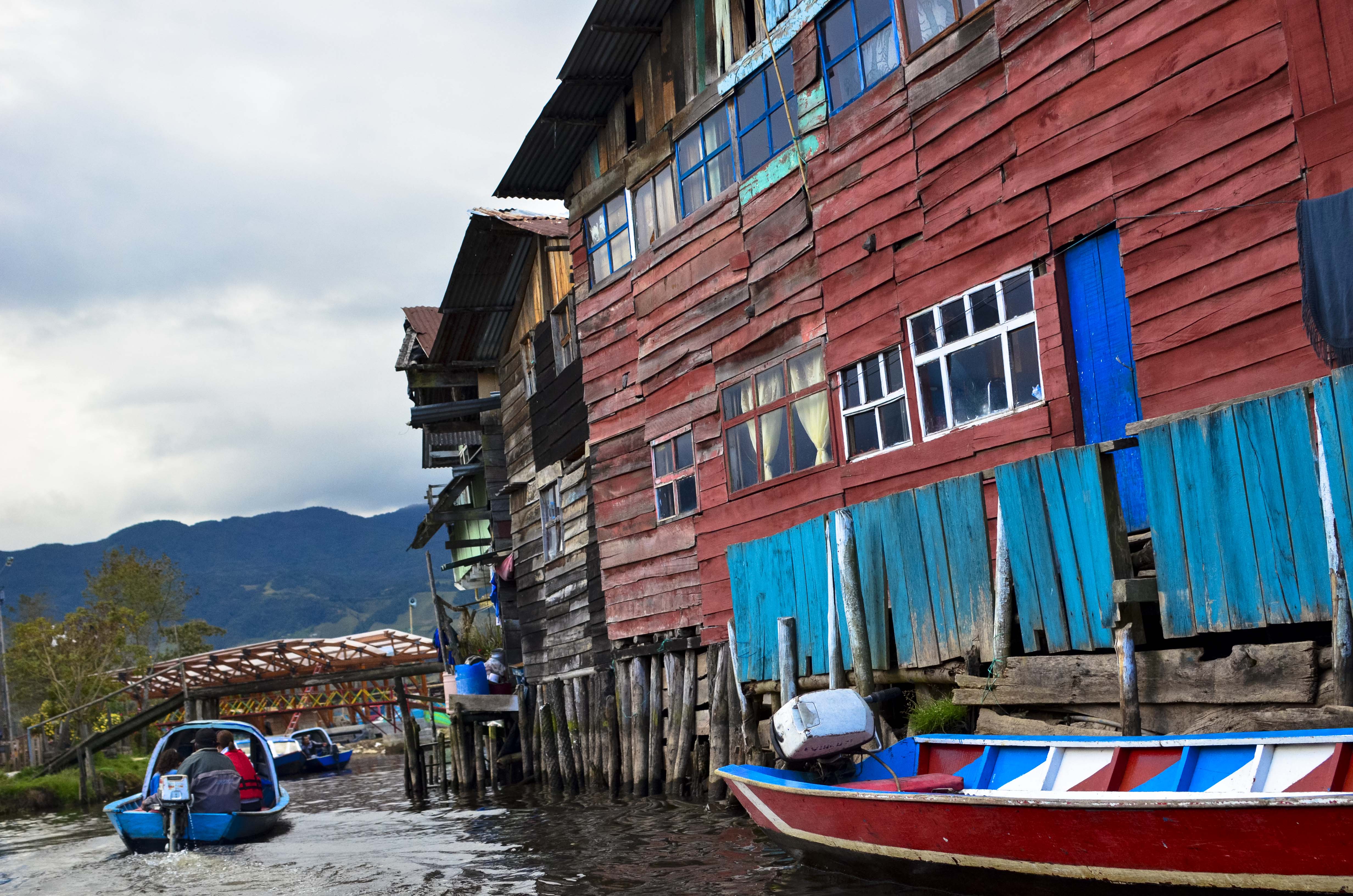 Ilse continued on her way to Ecuador early the next morning, so we bid our farewells. Elissa and I decided to spend some more time exploring the little village, so we went back into town to soak in some more pretty colored buildings and see how the town operated during it’s daily routine. Children were helping their parents with chores like chopping wood and bringing in the daily catch, because it seemed that school was not in session. Boats groaned slowly past us while we peered into windows of supply shops, and seemingly abandoned houses. Tables and chairs were set up waiting for the home owners to come back and wipe the dust off. The town was quiet, still, and beautiful on another tranquil day. We found a restaurant that appeared to be open, wandered inside, and made some noise until the owner appeared from behind a door where the living quarters were. We had a private breakfast upstairs on a deck overlooking one of the streams that fed the lake and connected the town. Pure bliss ensued.