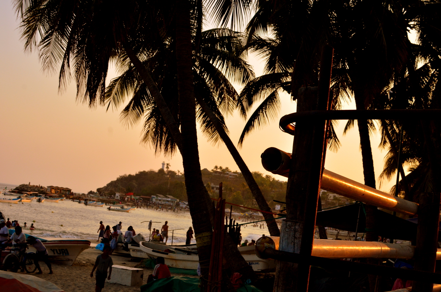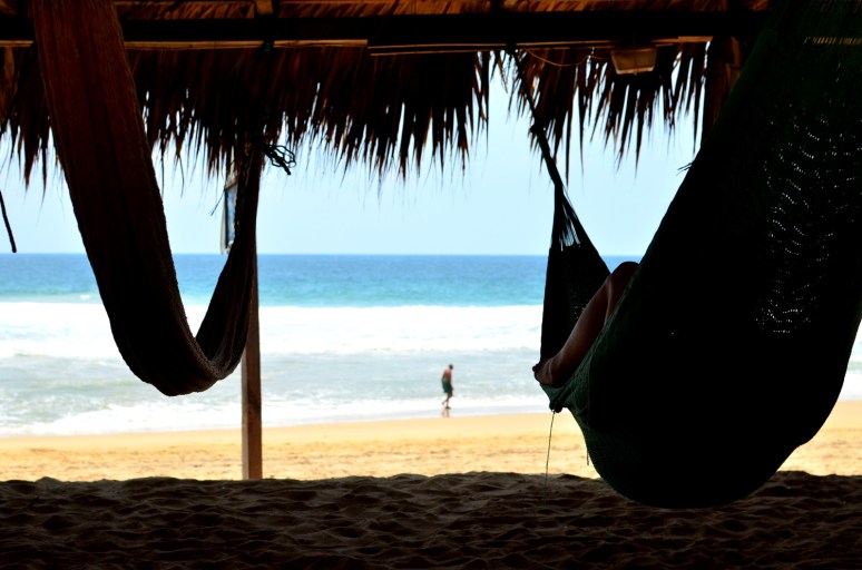 We spent a night in Puerto and saw the blue Mexican Pacific for the first time in the morning. By noon we had our packs on our back, and were sweating profusely trudging up hills towards the shuttle location. A taxi driver heard us talking and stated he was going that way anyway and would give us a great deal to get closer to our little beach haven. We agreed, and wound up running errands with him and his aunt (his other passenger and reason he was in this town in the first place). He kept telling us “10 minutes, no problem, we leave soon”. We waited at the bank, went to a social program office, and got an oil change. Frustrated from an hour and a half of personal personal and the climbing thermometer we were finally heading towards Zipolite. Palm trees were now dominating the landscape and my mind was reeling thinking about our destination. A small fishing boat brought us through a lagoon and dropped us off on land where a collective truck was waiting. We crammed 10 humans and supplies into the back of a pick-up truck and drove down a sandy road for about half an hour until we reached paradise.
